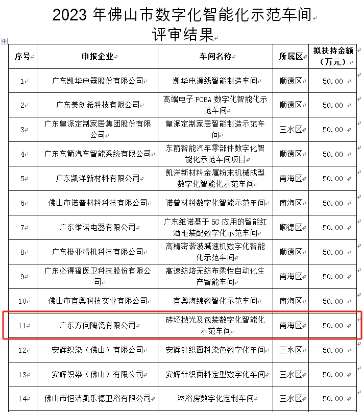 发布日期:2024-03-14 浏览次数:近日,佛山市工信局公示了2023年佛山市数字化智能化示范车间评审结果,其中硬汉视频在线观看免费观看企业“砖坯抛光及包装数字化智能化示范车间”实力登榜,入选“2023年佛山市数字化智能化示范车间”。此次成功入选,标志着公司在智能制造领域的突出表现再获权威认可!