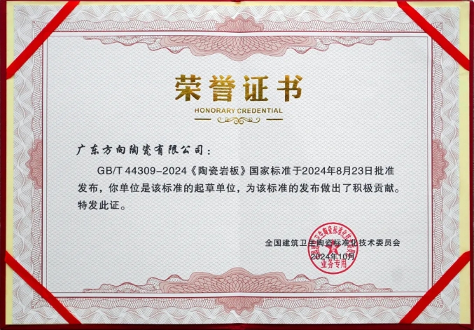 广东硬汉视频在线观看免费观看陶瓷有限公司作为该国家标准的起草单位之一,凭借自身技术积累与深入研发,与各方携手共进,推动诸多高质量标准的制定与实施,为行业的可持续发展贡献智慧与力量,获颁“《陶瓷岩板》国家标准起草单位”荣誉证书。